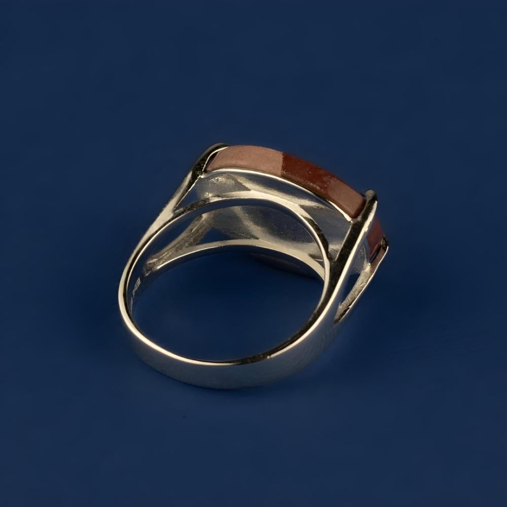 خاتم أنيق مصنوع من الفضة عيار 925، يزدان بحجر فاخر يتميز بلون العقيق الأحمر الملكي الممزوج بدرجات فاتحة تضفي عمقًا وأناقة متجددة. يُثبت الحجر بأذرع تصميمية متقنة تمنح الخاتم مظهرًا انسيابيًا متوازنًا بين القوة والرقي. هذا التصميم يعكس تمازج الحرفية العصرية مع اللمسات المستوحاة من التراث الثقافي.