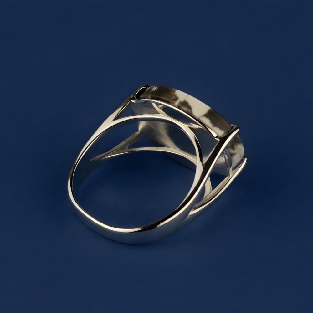 خاتم فضة عيار 925 يتميز بحجر طبيعي أبيض مع عروق سوداء متداخلة، ما يمنحه مظهرًا فريدًا وأنيقًا. يتم تثبيت الحجر باستخدام مخالب فضية مصقولة بدقة، لتعكس الحرفية العالية والتصميم العصري. خيار مثالي للإطلالات اليومية والمناسبات المميزة.